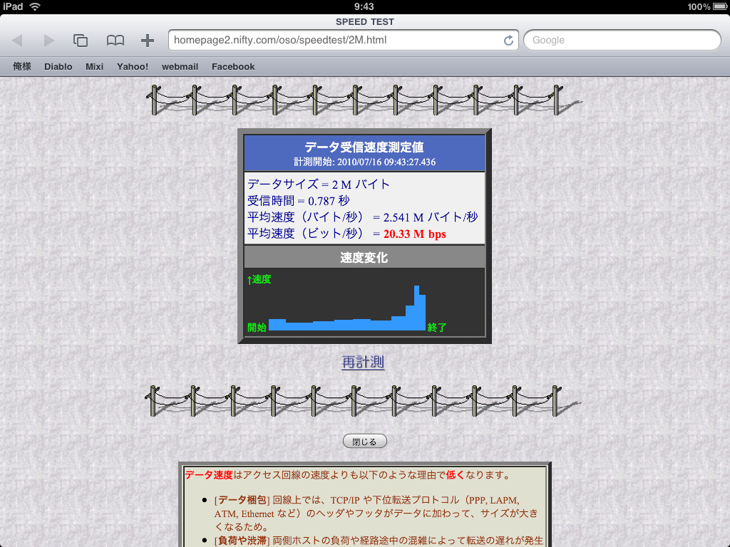 左はiPadでIEEE 802.11 g で通信をした時のスピードテスト結果だ 54Mで全2重であれば これ位だろう