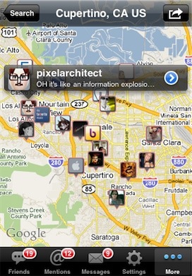 | Twitterお勉強中の俺はせっかくだからiPhoneからTwitter出来た方がいいと思ってtwittelatorっていうソフト入れてみた そしたらビックリ! 検索から「近くに人」ってあったから検索してみたら 自分のいる場所を中心に回りの地図上に沢山のTwitterしている人達が見えてくるぅぅ これはもう 出会いツールに間違えないなw 使い方はいろいろだろうな^^ |