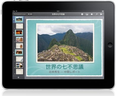 | その次に使って感動しているDLしたアプリはKeynote だ これはアップル公式サイトのiPadでも押しているプレゼンテーション用ソフトだ パワーポイントのファイルもこのKeynoteで読みこめる とても便利だ これでプレゼンテーションを作成が楽々だ |