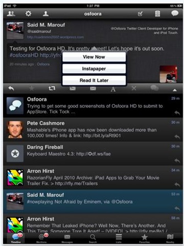 | 後はSkypeとTwitterクライアントでOsfoora HD これもかなりいいね iPadでこのアプリを使うと なんかすごく大きな画面でTwitterやってるようだw |